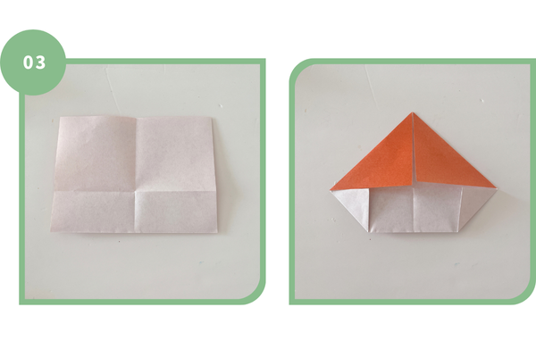 3.裏返しにしてから、上の左右の角を中心線に合わせて谷折りにし、さらに下の角も左右それぞれ谷折りにする