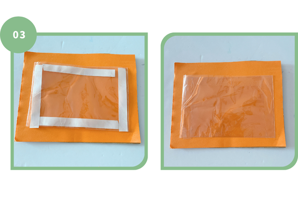 3.透明の袋を写真サイズに切り、両面テープで貼る