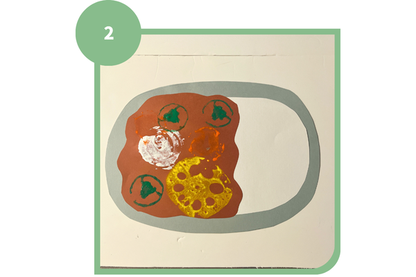 2.野菜の切れ端に絵の具をつけ、スタンプしていく