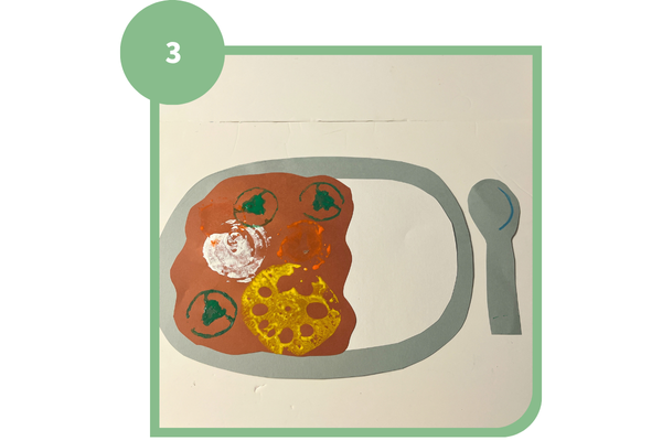 土台となるカレーライスは、はさみが使える年齢の場合、色画用紙に切り取り線を書いておくことで子ども自身で切ることができます。