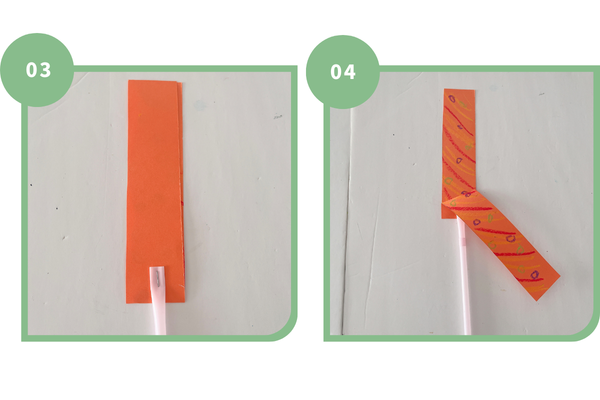 3.色画用紙を半分に折り、輪の部分にストローを当てホチキスで留める