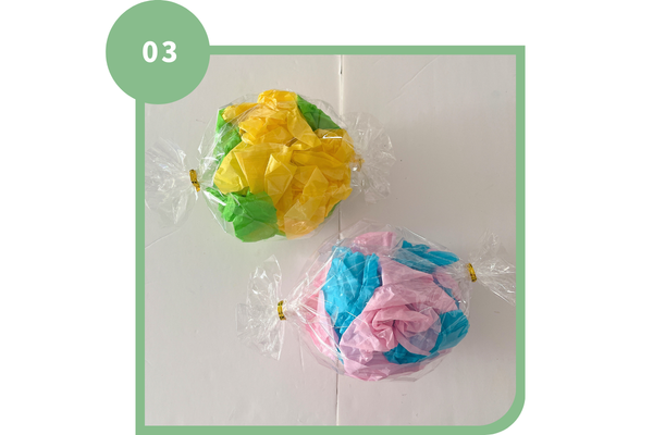 2.くしゃくしゃにしたお花紙を透明な袋に入れる