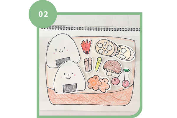 ①でお弁当箱の上に透明テープを貼っているので、おかずのパーツを貼ったりはがしたりして遊ぶことができます。