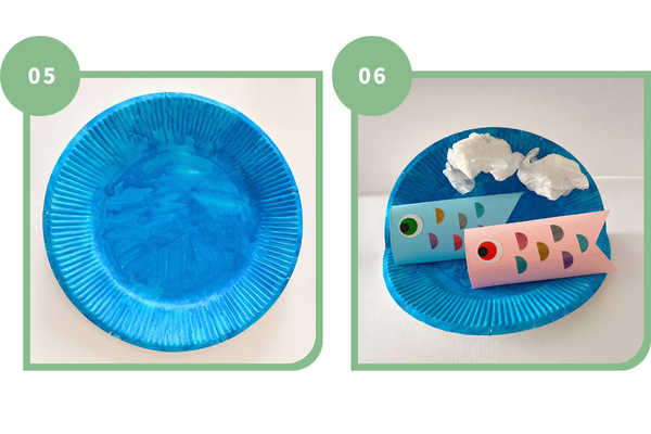 6.紙皿を半分に折り、下部にこいのぼりを貼り付け、上部にくしゃっとしたティッシュを雲に見立てて貼り付けたら完成!