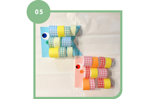 5.丸シールで作った目を貼り、色画用紙で作ったヒゲを貼ったら完成!