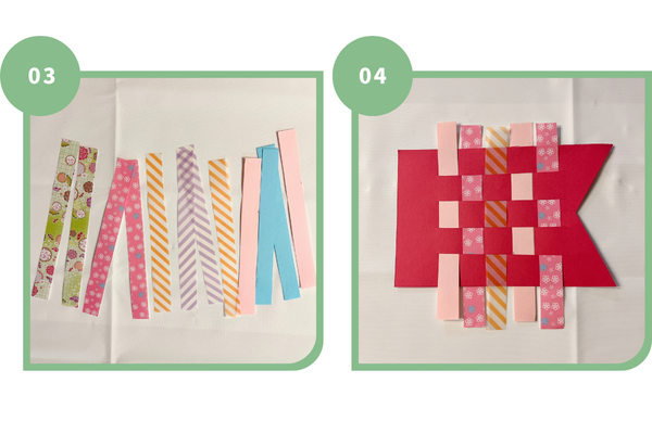 4.細長く切った折り紙を2に編み込んでいく